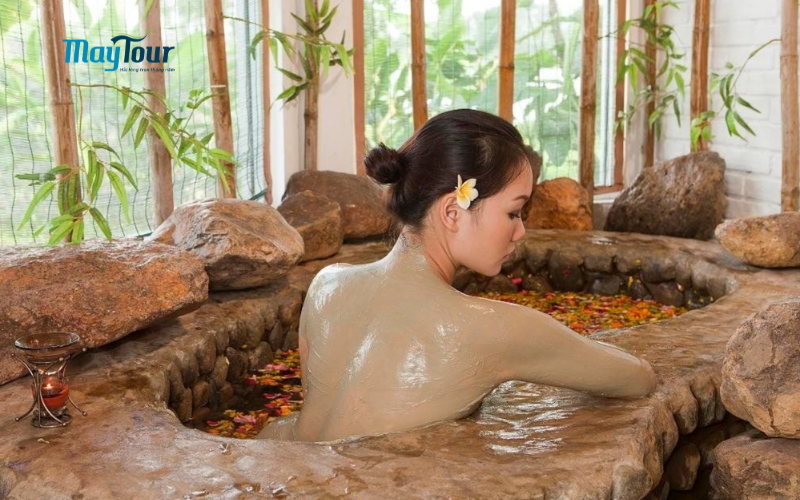 Xe đưa đoàn đến khu tắm bùn khoáng nóng Nha Trang – hoạt động thư giãn không thể thiếu trong mọi tour du lịch Nha Trang 3 ngày 2 đêm. Nguồn khoáng nóng tự nhiên giúp làm sạch và tái tạo da, hỗ trợ lưu thông máu, giải tỏa căng thẳng sau hành trình dài. Trong làn nước ấm, bạn sẽ cảm nhận trọn vẹn sự thư thái và hòa mình giữa không gian thiên nhiên xanh mát.