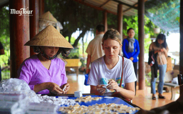 Tham quan lò kẹo dừa Bến Tre: Đến Bến Tre – “xứ dừa” của miền Tây, du khách được tận mắt xem quy trình làm kẹo dừa thủ công và bạn có thể thưởng thức nhiều loại kẹo dừa và mua về làm quà tặng. Điểm tham quan này được nhiều du khách đánh giá cao trong tour Mỹ Tho Bến Tre 1 ngày trọn gói, bởi vừa trải nghiệm vừa gợi lên bản sắc văn hóa nghề truyền thống của người dân.